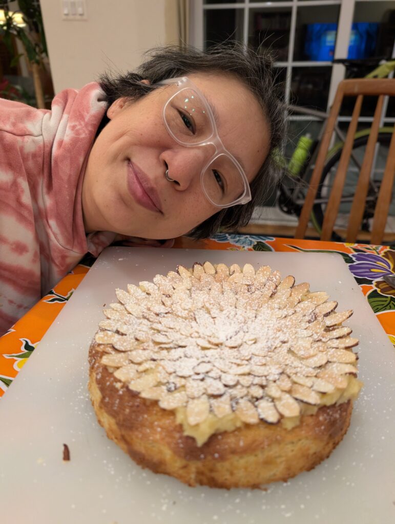 I made this almond cake over the weekend. As I was organizing the baking drawers, I noticed some almond flour, so I made this one – no butter! Just leavened with egg whites whipped into meringue. I’m proud of myself with this one because I got this recipe off of a sketchy-ish website and so I had to modify it a lot. I added cream of tartar to stabilize the egg whites and also vanilla and almond extract to bring out the flavor. I also knew that the almond flour mixture was too thick to fold into the meringue, so I diluted it with whole milk. I used some frangipane I had in the freezer as a topping and! I toasted the almonds that went on top to bring out the almond-y flavor. It was not bad. hahaha, no it was good. I really do like the almond flavor – one of my favorite.