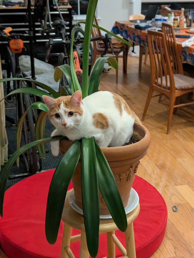 Within 5 minutes of him being home, he jumped into my plants. And then we moved the plant further away from possible launching sites and then he figured out again how to get into the plant. I’m sure now Elka is eating poop from the litter box.