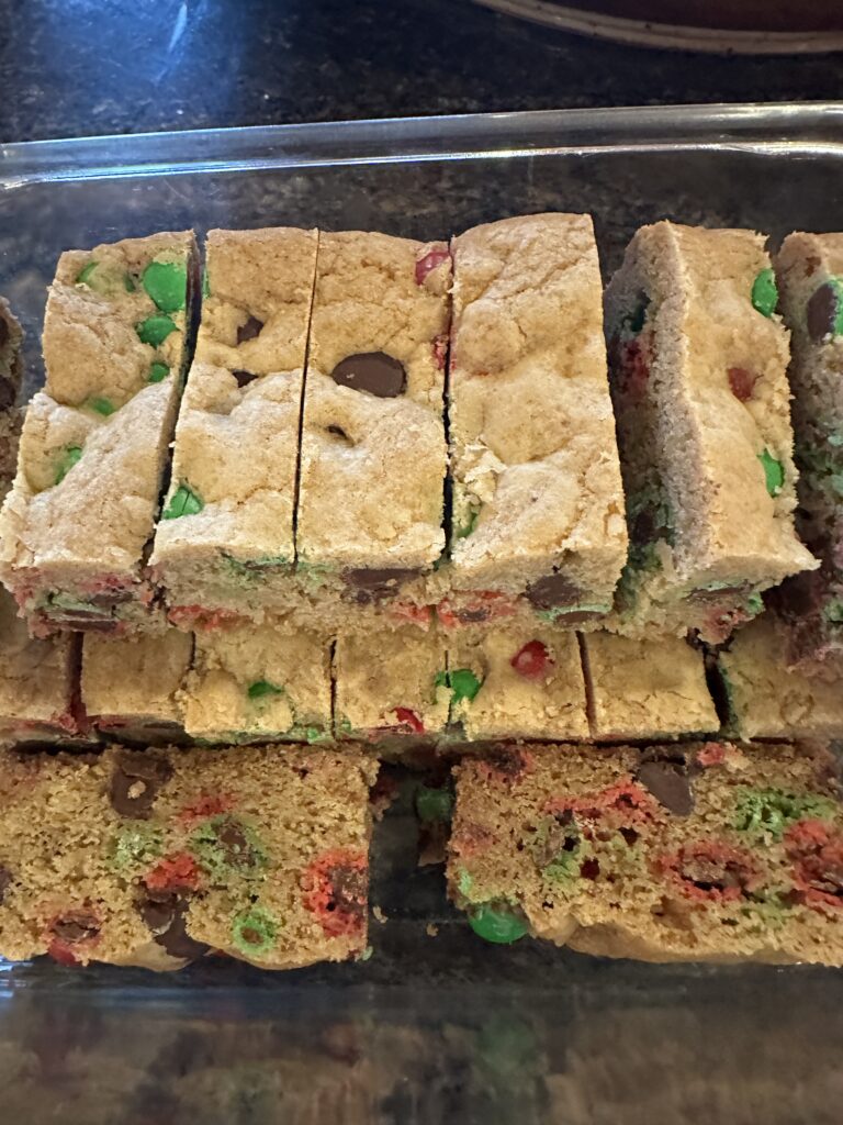Edda came home ill on Monday which was the same day we were having the Martin Secret Santa. Jeremy and I had a back-and-forth about who should go and who should stay home with Edda. In the end, I went – I had baked the desserts and I was more invested in the gifts that I had bought – it was a really nice evening, esp since Jane was in town and we got to hear a lot about her job. I did bake a “main dessert” – these chocolate chip brookies which are …fine but not amazing.
