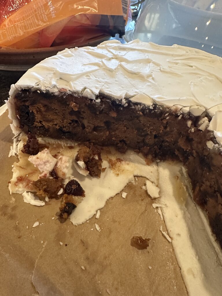 My fruitcake – which I started in October ended up…ok. The last layer of royal frosting on the outside dried to a plaster-like consistency and cracked severely when the knife went through it to slice. I was hoping that I would end up liking fruitcake – but really, I ended up deciding that a chocolate cake is much much better. I’m disappointed because I have a lot of fruitcake, but I’m happy I tried this recipe.