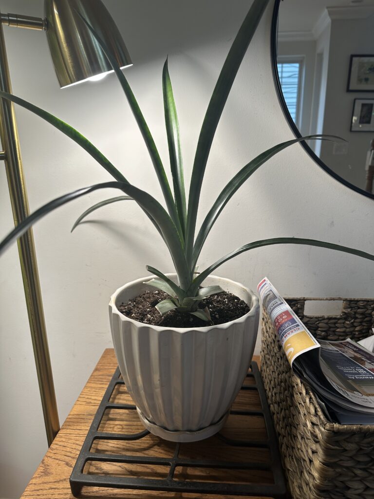 This is a pineapple plant from a grocery store. I think someday it’s suppose to pop out a pineapple and then die. But I think it’s never going to get enough light to do that. I got this from my friend Hiroko who did successfully grow a pineapple in her front yard.