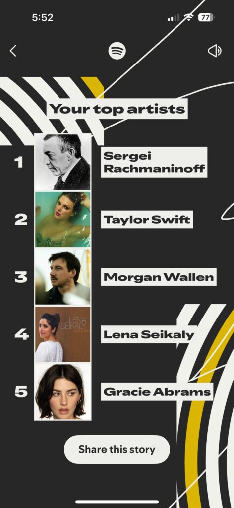 I did not listen to a lot of music this year, I focused mainly on learning music – but apparently Taylor Swift got knocked out of the #1 spot for the first time in like a decade by Rachmaninoff! I kind of can’t believe it.