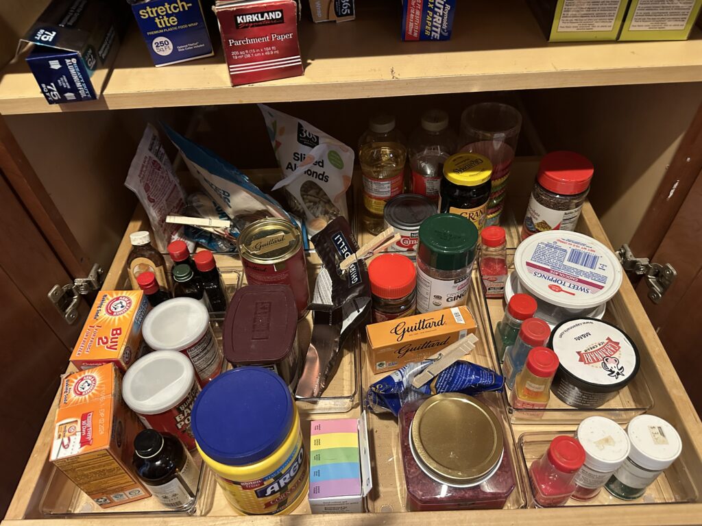 I also am organizing my baking drawers which after about a year of steadily baking, I know what I want and where I want it. I bought my little tray organizers I like and sorted everything. Now I can see my nuts, my flavorings, my decorations, my different sugars. I’m very happy.