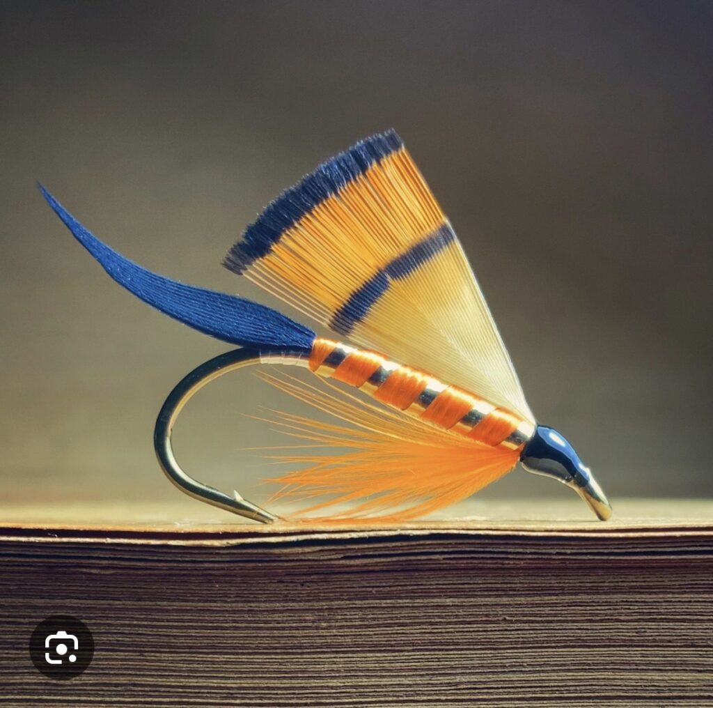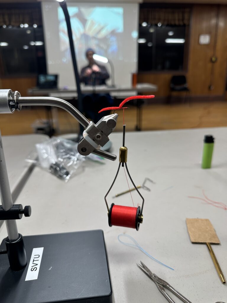 Then Megan texted back, I can cheer you on from shore while you fly fish and then I admitted that what I really was to invite her to a fly tying class which can be completely separate from fly fishing and involves absolutely no water. Crafty! I said. (No one likes crafts more than Megan). And she was hooked (lol. see what I did there? punny). Look at this gorgeous fly – I can see why some folks want real feathers from real, dead, extinct birds to do this…