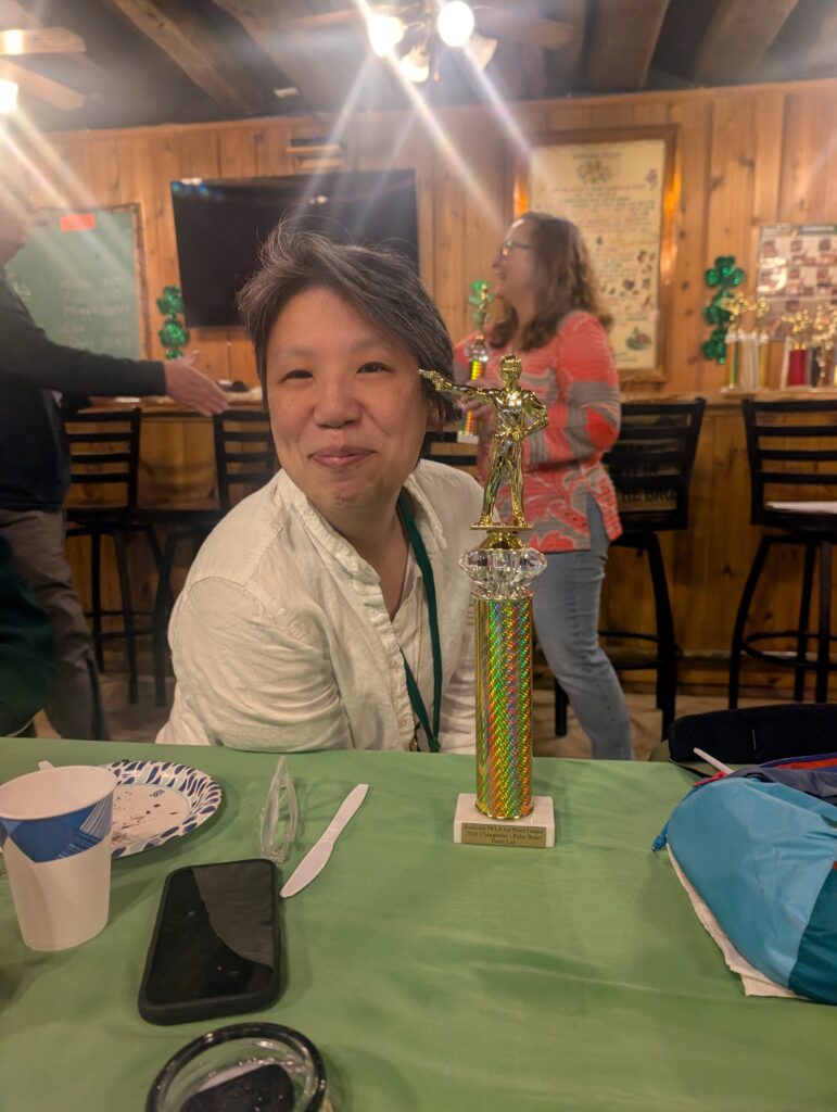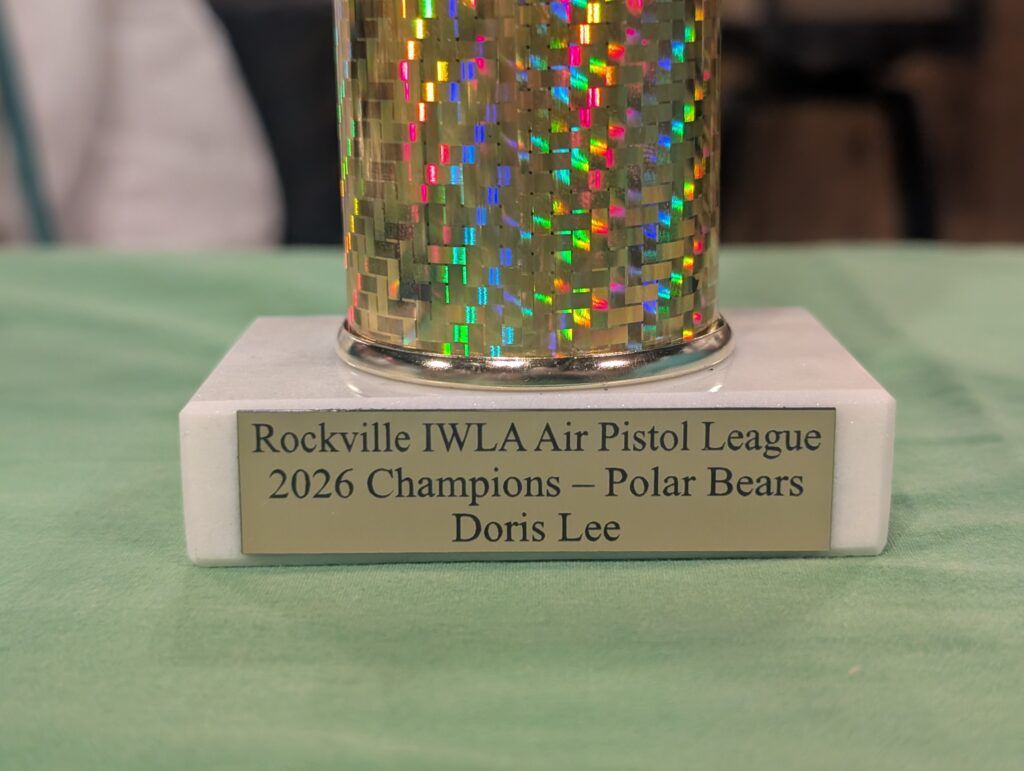 Last week my air pistol team won the winter season air pistol league. There was a celebration dinner – pulled pork and potato salad and delicious pudding cake. Jeremy and Edda came with as they had never seen the league’s building and met the people I target shoot with. It was fun and I got a trophy for the first time in a long time. They even typed my name on it.