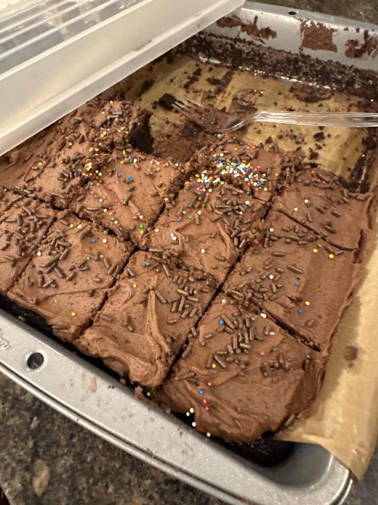 I wasn’t worried about the amount of cookies and/or cake because right after the dinner celebration, we went to Main Street to celebrate Sharon who is stepping down from her role at MS after 5 years. It was a baking celebration, so I brought the rest of the cookies and cake. But we were ever so slightly late and there were so many sweets that my cookies and cake did not get eaten. But because the cookies were on a paper plate…shhhh, I left them because there were only about 7 left. But the cake was all ours.