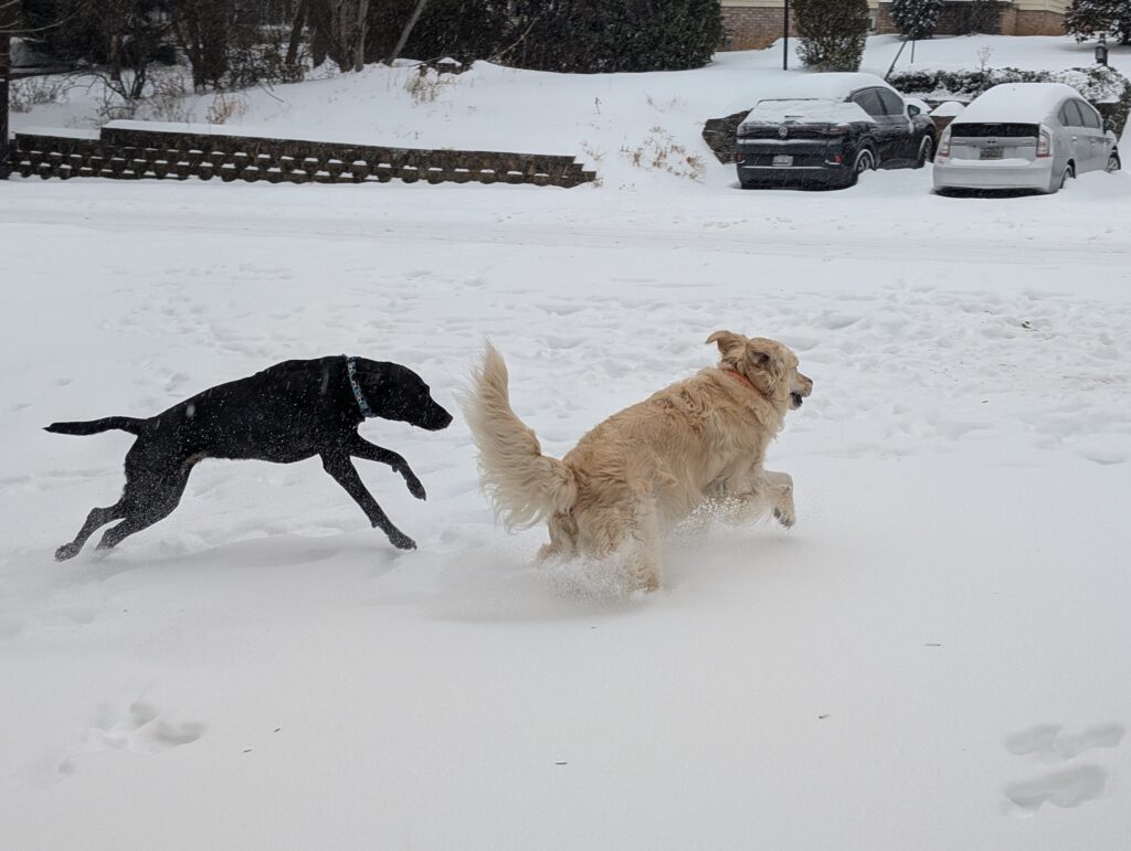 Sunday, it snowed. Elka played in the snow with Apollo.