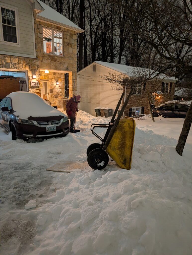 We shoveled at night after the snow ended at about 8 pm because Christine, our basement tenant who parked in the driveway, needed to report to her nursing gig early in the am on Monday. So we made sure she could get out in the morning.